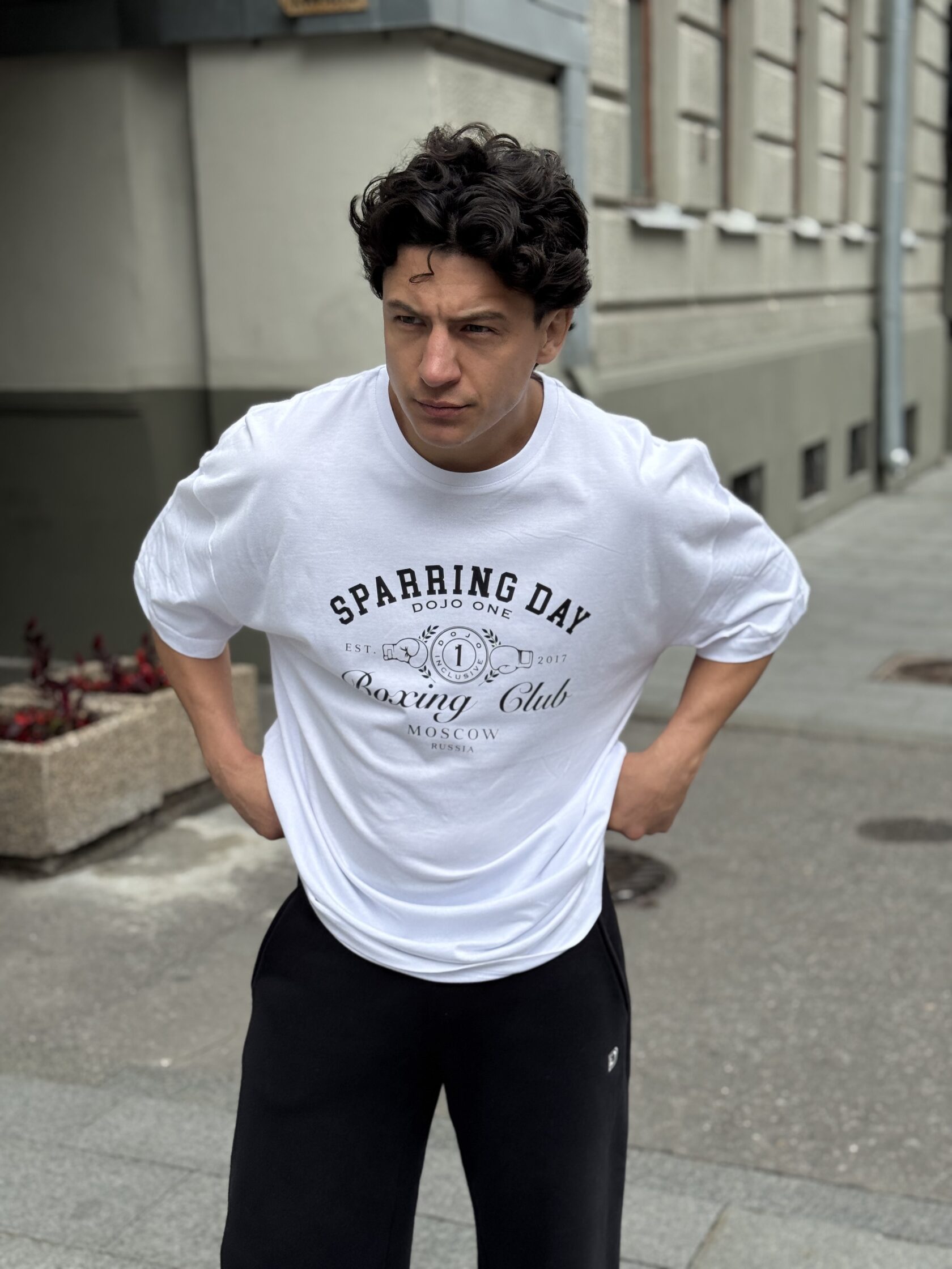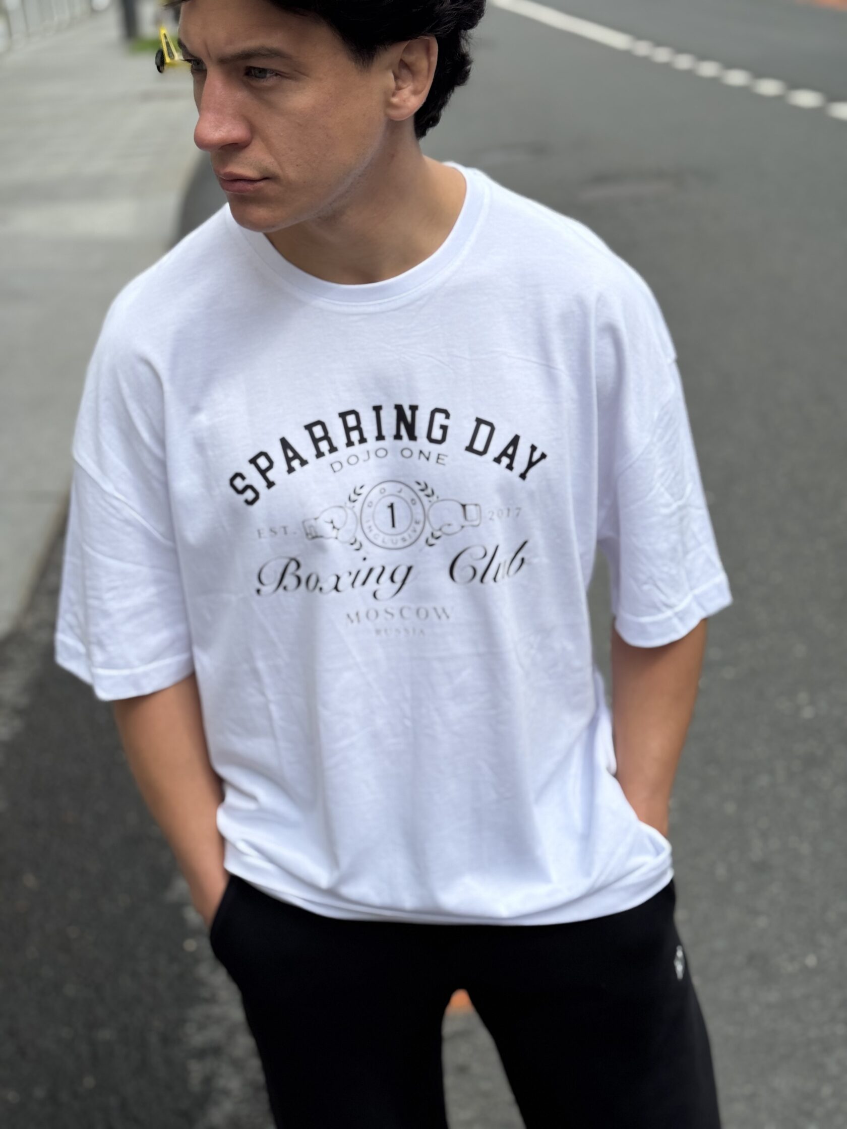 Майка белая, с круглой горловиной из качественного хлопка в составе которой присутствует лайкра позволяющая коже дышать. Название ткани кашкорсе- это вид трикотажа изготовленный способом «английская резинка». В вещах из этого материала всегда легко, уютно, комфортно. Спереди модель украсили белым контрастным логотипом, который является символом бойцовского клуба D. Размерный ряд: M, L